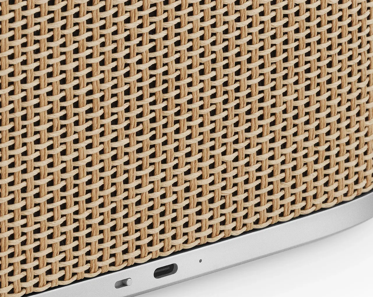 Beosound A5 podpira številne sodobne povezave: Bluetooth 5.2, Wi-Fi 6, AirPlay 2, Chromecast in Spotify Connect, zato ga lahko hitro povežete z vašim telefonom, tablico ali drugimi napravami. Vgrajena baterija omogoča do 12 ur delovanja, hkrati pa ima vrh zvočnika funkcijo brezžičnega polnjenja za telefon ali druge naprave.