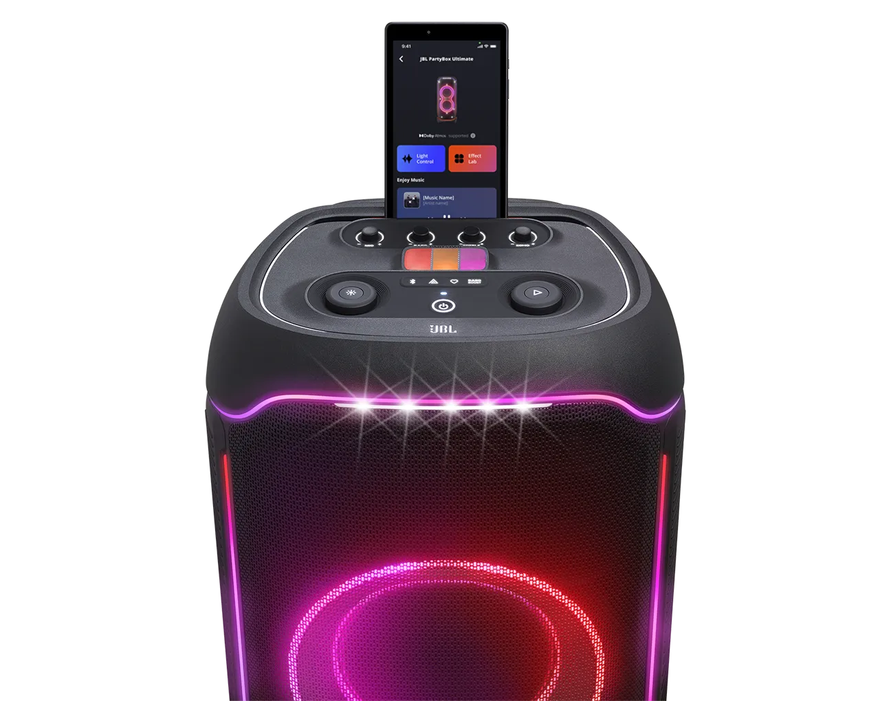 Upravljanje svetlobnih učinkov preko aplikacije JBL One ali nadzorne plošče na vrhu zvočnika.