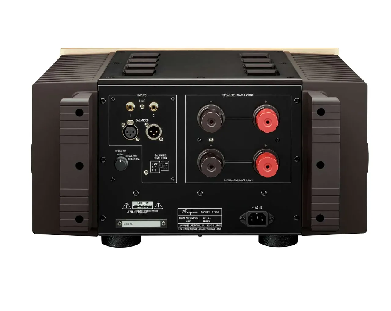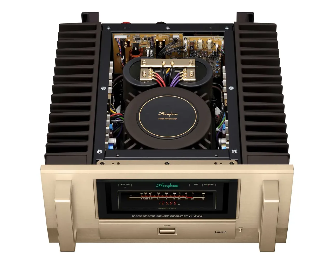 Ustvarjen ob 50. obletnici podjetja Accuphase, A-300 na novo definira ideal močnostnih ojačevalnikov razreda A. Izhodna stopnja z 20-paralelnimi push-pull MOS-FET tranzistorji izboljša zmogljivost za 25 % v primerjavi s klasičnimi modeli ter zagotavlja izhodno moč 125 W pri 8 Ω, 250 W pri 4 Ω, 500 W pri 2 Ω in 1.000 W pri 1 Ω, kar omogoča izjemno stabilno napetostno ojačenje. Popolnoma diskretni uravnoteženi vhodni ojačevalnik dosega raven tišine, ki vas bo popolnoma potopila v glasbo in vas pozabila na to, da poslušate avdio opremo.