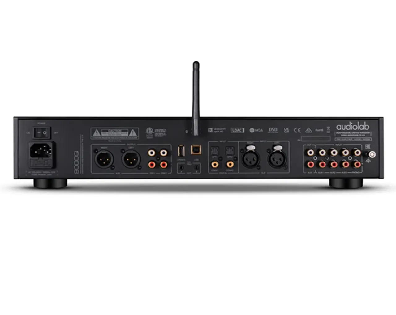 - Široka povezljivost: 3 analogni RCA linijski vhodi, 1 uravnotežen stereo XLR vhod, 1 MM phono vhod. 2 optična in 2 koaksialna digitalna vhoda (S/PDIF do 192 kHz/24-bit). Bluetooth 5.1 s podporo za aptX, aptX HD in LDAC. USB tipa B za povezavo z računalnikom.