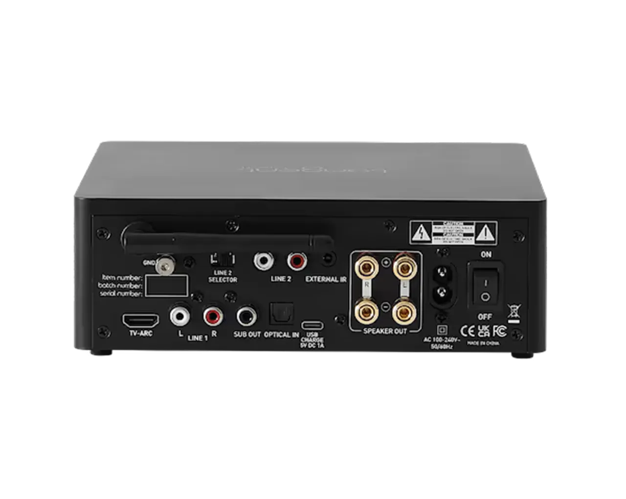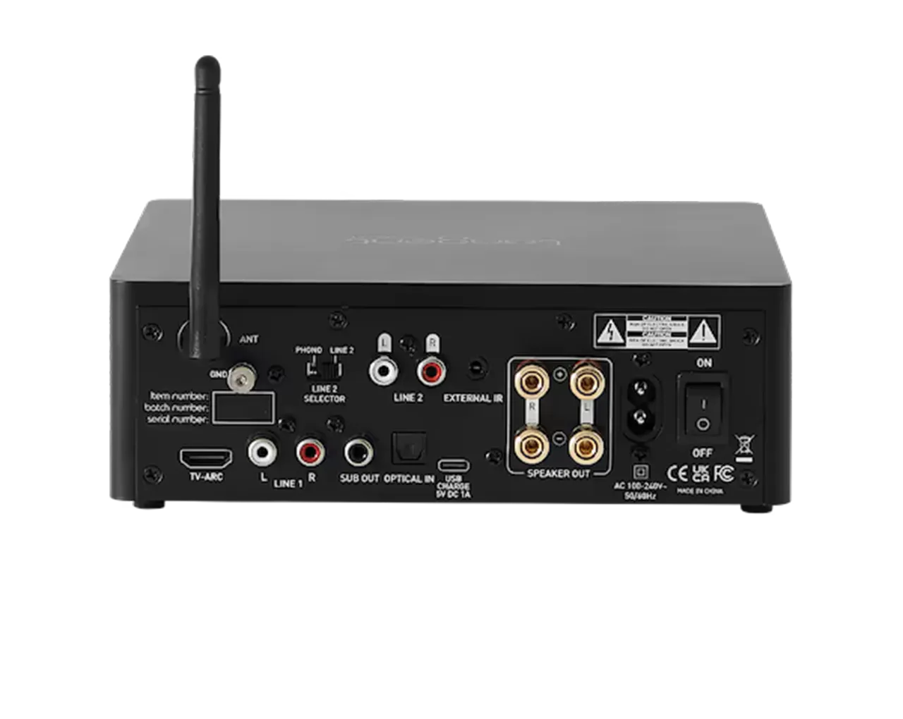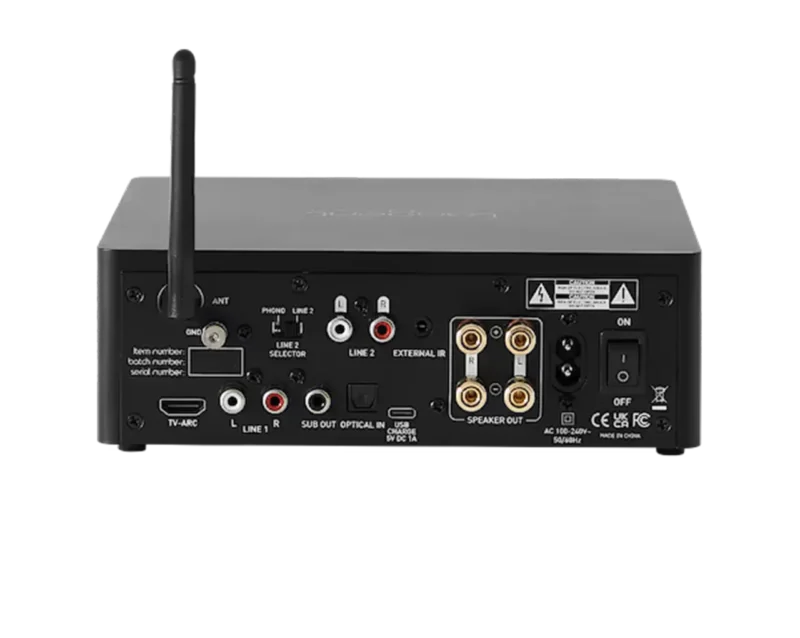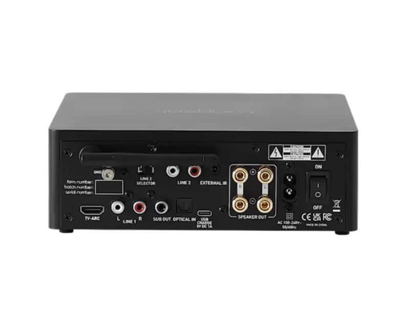 - Vhodi: 1× HDMI ARC/CEC; 1× optični Toslink; 2× RCA linijski; 1× RIAA phono (MM); USB-C (5 V/1 A) polnjenje