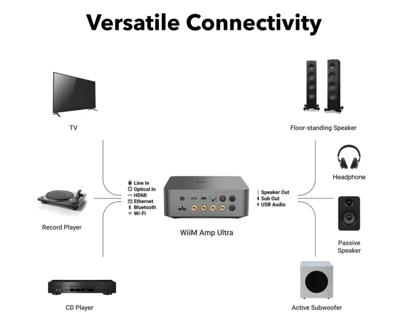 WiiM Amp Ultra omogoča napajanje do štirih zvočnikov z izjemno nizkim popačenjem (–106 dB THD+N) in visoko dinamično jasnostjo. Idealen je za ljubitelje glasbe in domači kino, kjer je kakovost zvoka na prvem mestu.