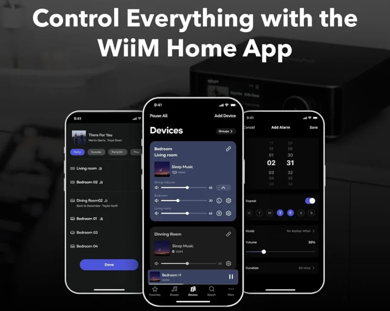 Združljiv z večsobnimi sistemi preko WiiM, Alexa Cast in Google Cast. Upravljate ga lahko preko aplikacije, glasovnih pomočnikov (Alexa, Google Assistant) ali priloženega daljinskega upravljalnika z glasovno podporo.