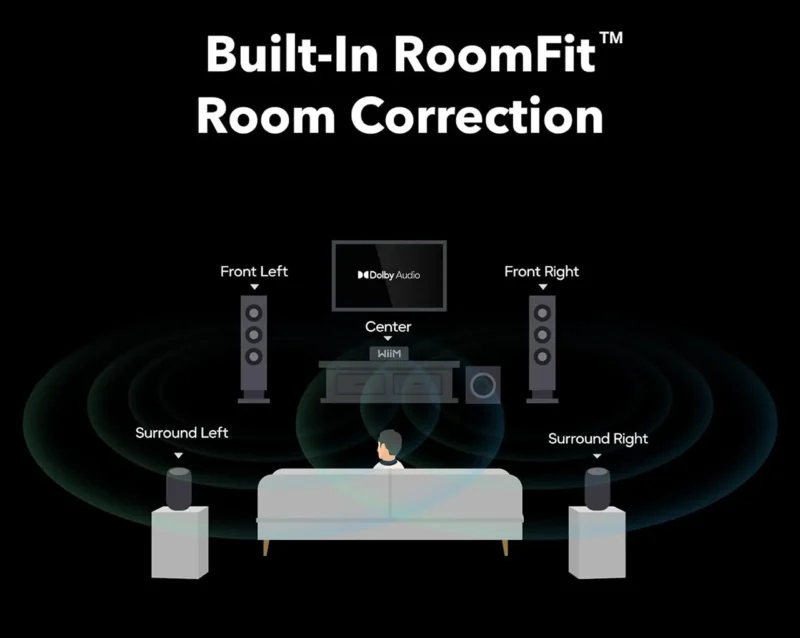 WiiM Amp Ultra samodejno prilagodi zvok glede na akustiko prostora in specifikacije zvočnikov, s čimer zagotovi optimalno in osebno prilagojeno zvočno izkušnjo.