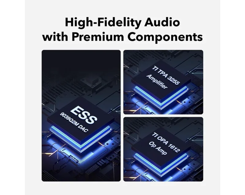 Uporablja vrhunske komponente, kot so DAC ESS 9039Q2M, ojačevalnik TI TPA3255 in šest operacijskih ojačevalnikov TI OPA1612 za ultra nizko popačenje, odličen dinamični razpon in čist, brezšumen zvok.