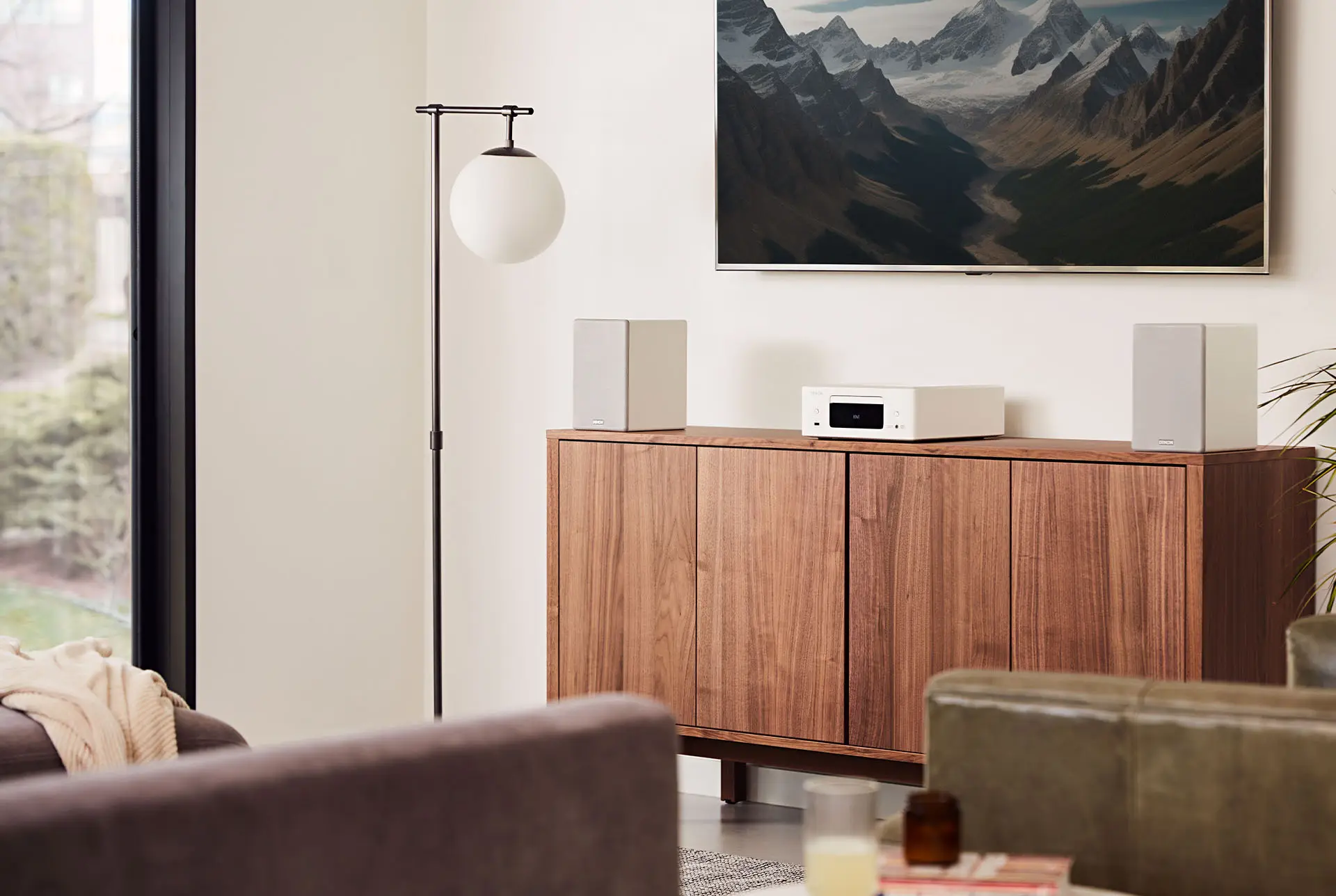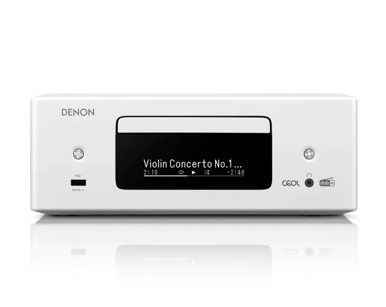 Uživajte v izjemnem zvoku, v minimalističnem slogu. CD/Receiver Denon RCD-N12DAB z vgrajenim prenosom glasbe HEOS, Bluetooth® in glasovnim nadzorom je popoln kompaktni stereo za vse vaše glasbene želje.