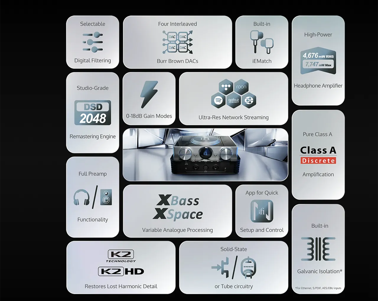 - Referenčni DAC, predojačevalnik, mrežni streamer in ojačevalnik za slušalke v eni napravi