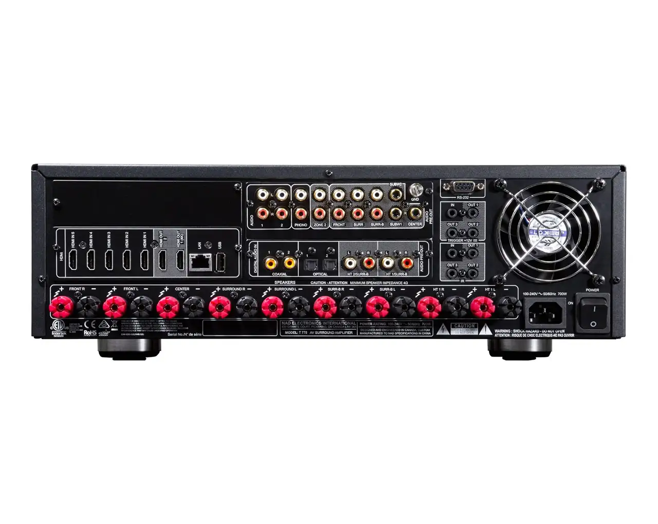 AV prostorski sprejemnik Nad T 778 vključuje najnovejše dosežke NAD-ove hibridne digitalne tehnologije za ustvarjanje 9 visokotokovnih/visoko močnih kanalov ojačanja z izboljšano učinkovitostjo. NAD AVR, zasnovan z NAD-ovim pristopom popolnega razkritja ocen moči, konzervativno zagotavlja 85 W FDP in 9 x 140 W FTC, vsi kanali pa delujejo pri nazivnem popačenju. Zaradi prilagodljivosti je mogoče kanale ojačevalnika konfigurirati tako, da se uporabljajo za prostorski zvok ali zvok drugega območja. Tiho črno ozadje in eksplozivna dinamika, ki ju omogoča ta ojačevalna tehnologija, dodaja realistični realizem, dramo in razburjenje vsej vaši glasbi in filmih.