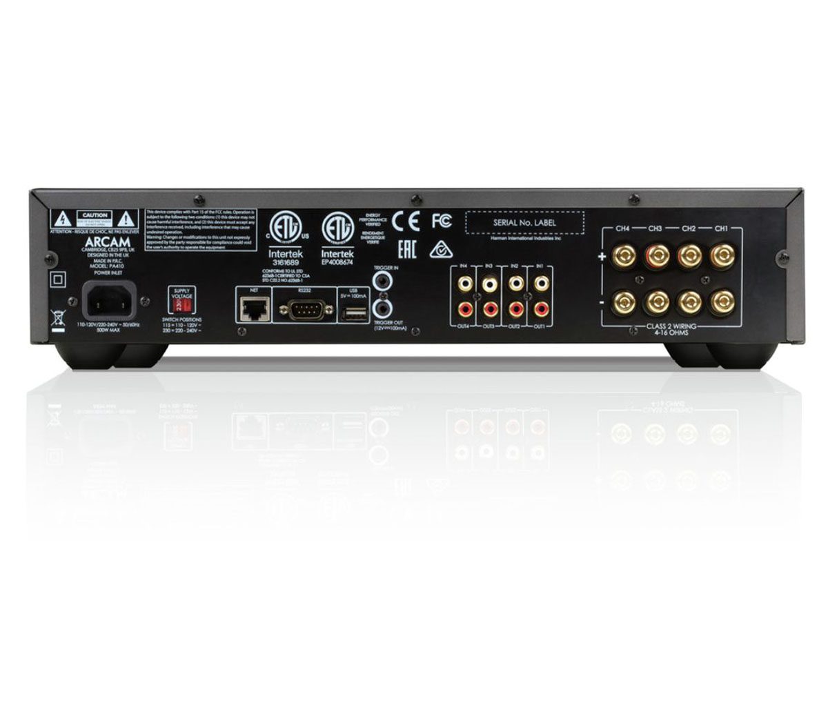 Zmore 50W prave sinusne moči na štirih kanalih ob predvajanju celotnega frekvenčnega območja pri impedanci 8 ohm in popačenju 0,2%. Pri 4 ohm moč naraste na 70W na kanal. PA410 je visoko zmogljiv ojačevalnik moči, ki zagotavlja 4 kanale učinkovitega ojačanja razreda AB. Z omenjenimi 70 W na kanal je zasnovan tako, da nudi največjo prilagodljivost in moč brez ogrožanja nadzora. Če se koristita samo dva kanala, je sposoben nuditi do 90W rms prave moči na vsak kanal z zelo nizko šumnostjo.