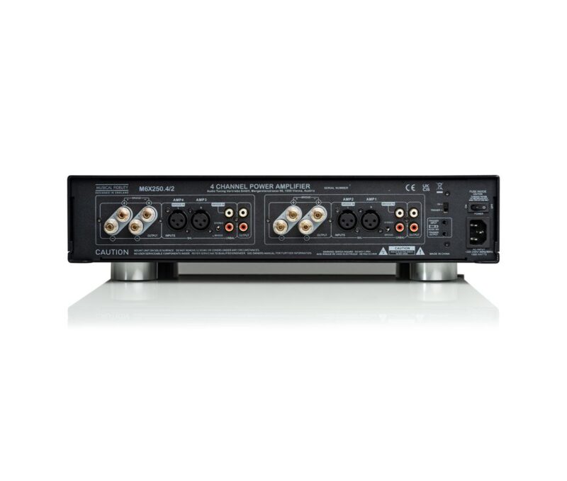 4-kanalni ojačevalec Musical Fidelity M6x 250.4/2 je izdelan modularno z 250 W oz. 175W (gnani 4 kanali) ojačevalno stopnjo razreda A/B na kanal. Ojačevalnik smo zasnovali tako, da zveni zelo naravno z ohranjanjem vseh prehodnih in mikro informacij. Izjemno tihi avdiofilski napajalni transformator distribuira čisto moč, kar ima za posledico visok dinamični razpon in podrobno zvočno kuliso. To je glavna značilnost ojačevalnika za domači kino.