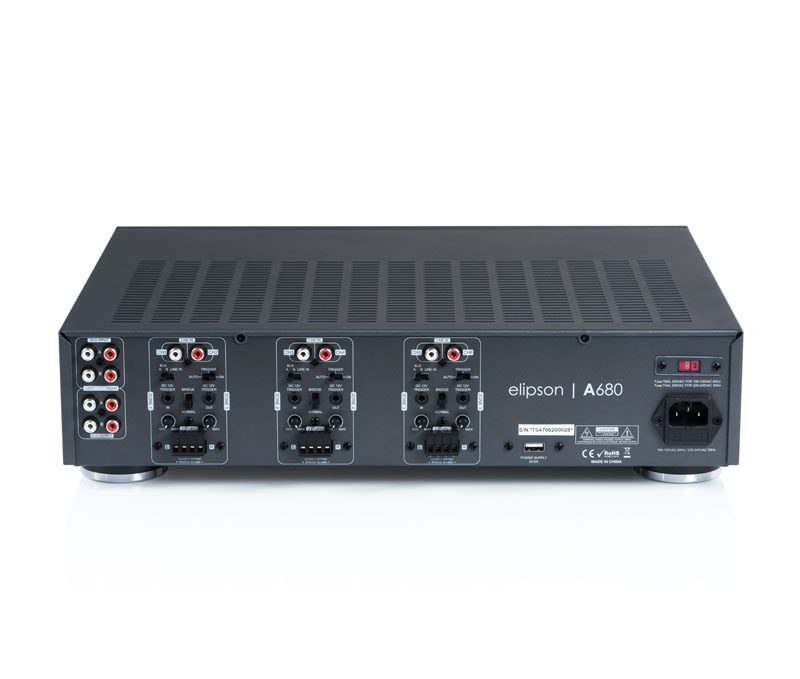 6-kanalni ojačevalec ELIPSON A680 obratuje v D-načinu. To pomeni malo pregrevanja pri polni obremenitvi in seveda obenem manjšo porabo električne energije. V primeru ojačitev večih con, ga lahko montirate v standardno rack omaro – priložen je pritrdilni material. Na ta način je skrit vašim očem, nadzirate pa ga preko aplikacije (v primeru takega predojačevalca).