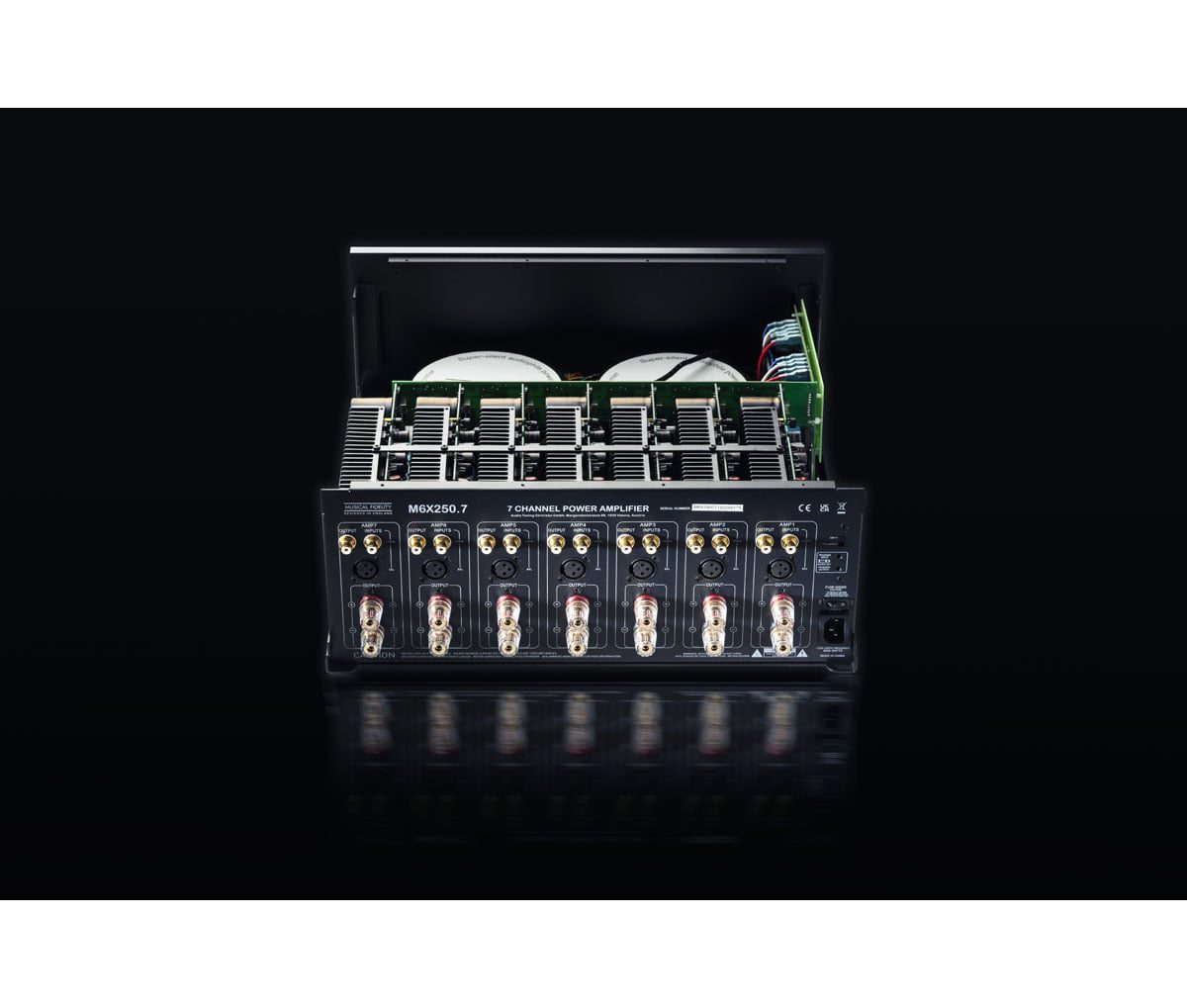 7-kanalni ojačevalec Musical Fidelity M6x 250.7 je izdelan modularno z 250 W ojačevalno stopnjo razreda A/B na kanal. Ojačevalnik smo zasnovali tako, da zveni zelo naravno z ohranjanjem vseh prehodnih in mikro informacij. Izjemno tihi avdiofilski napajalni transformator distribuira čisto moč, kar ima za posledico visok dinamični razpon in podrobno zvočno kuliso. To je glavna značilnost ojačevalnika za domači kino.