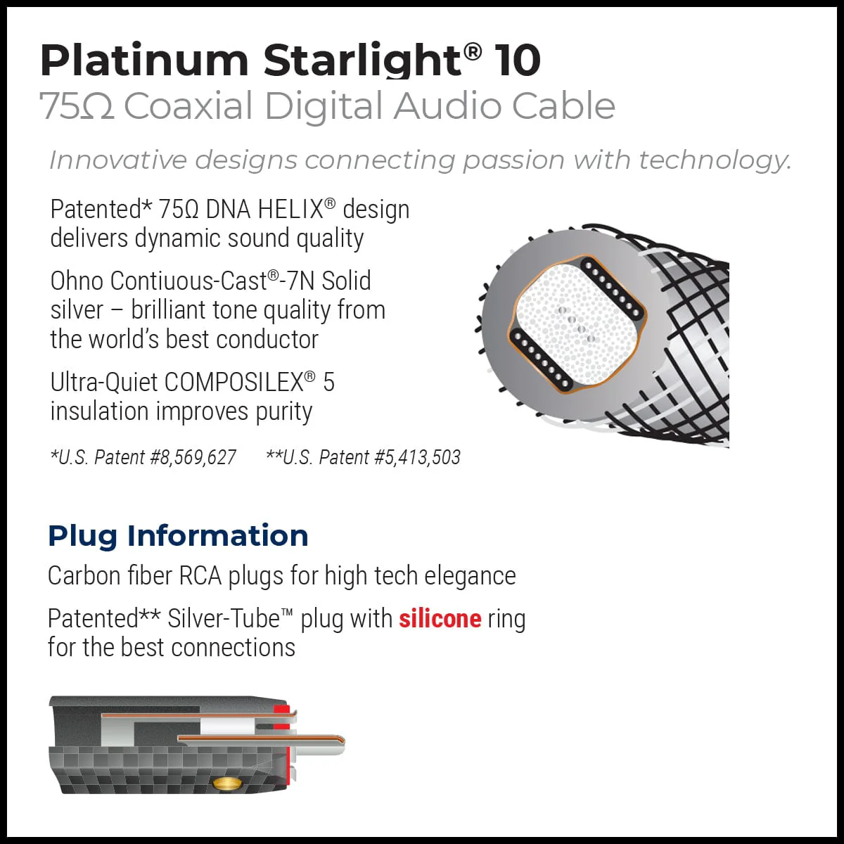 Platinum Starlight 10 je vrhunski 75-ohmski digitalni avdio kabel z OCC-7N masivnim srebrom in COMPOSILEX 5 izolacijo za izjemno pristno, holografsko reprodukcijo zvoka.