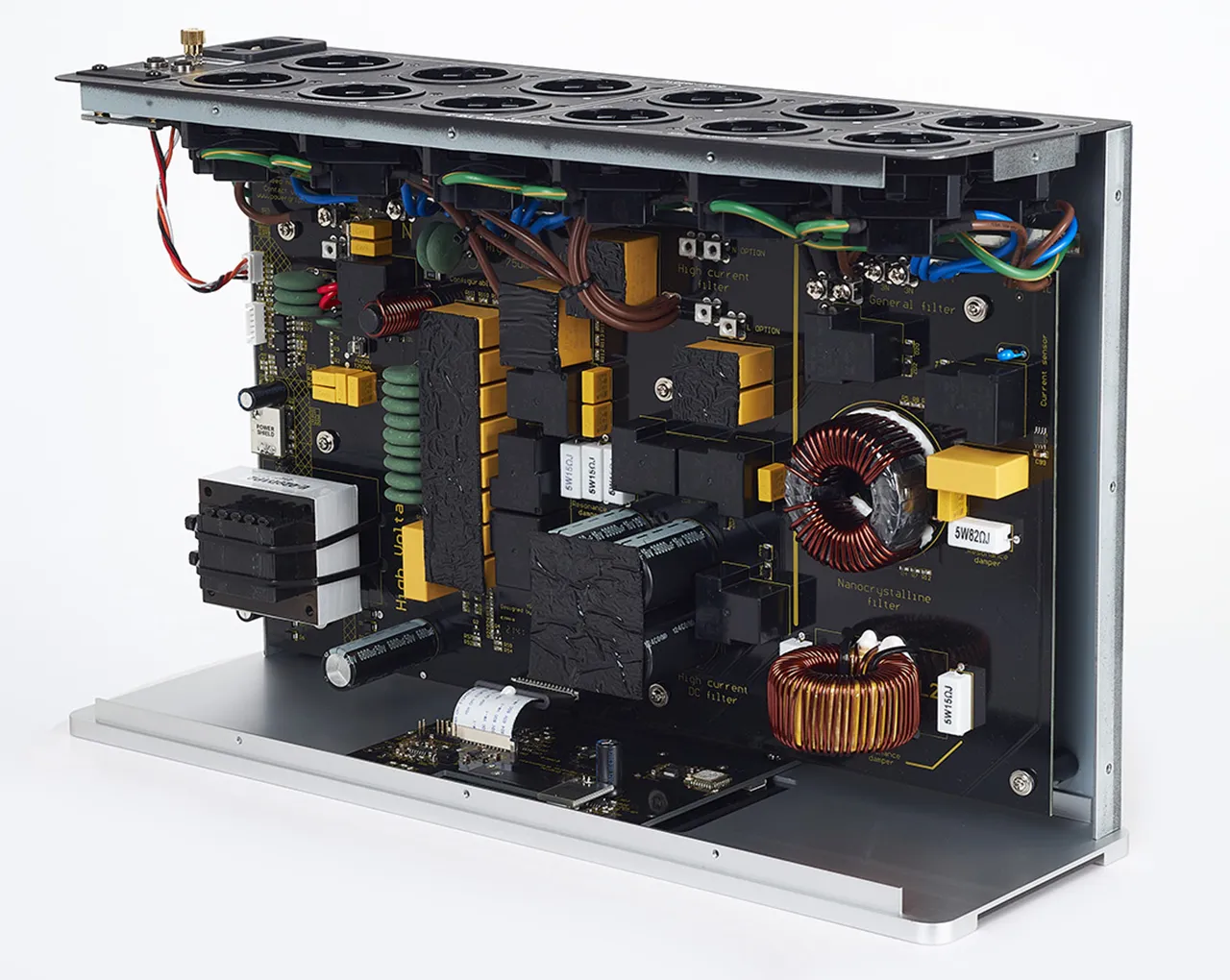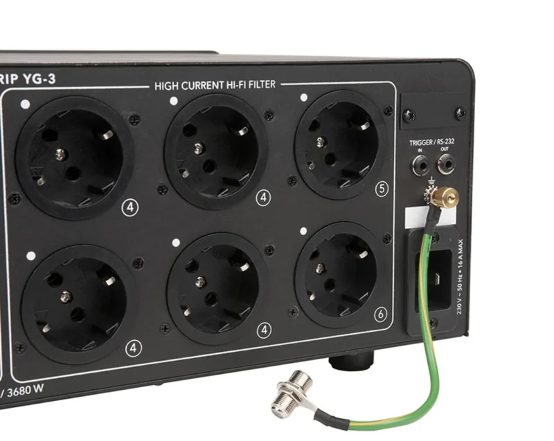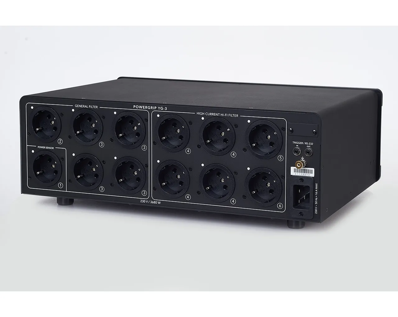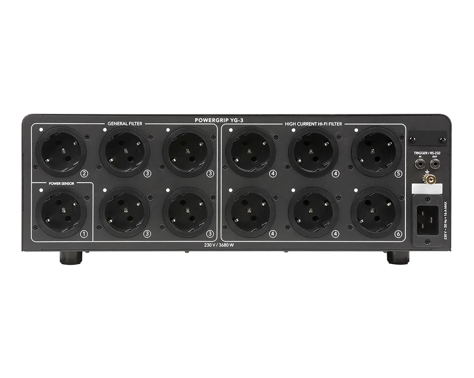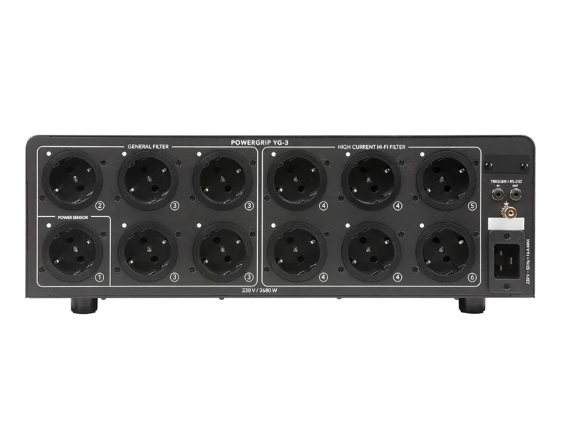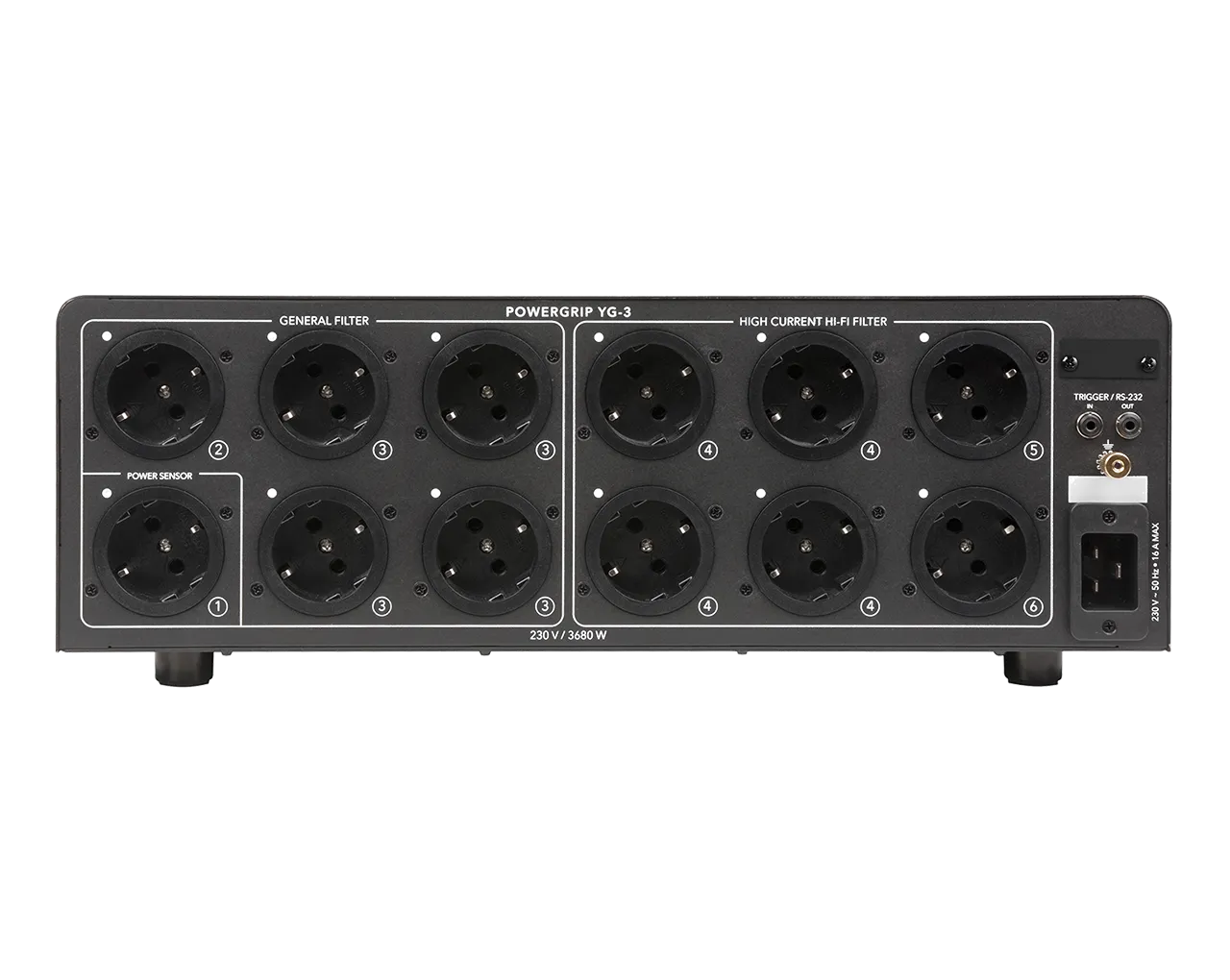 Powergrip YG-3 je napreden čistilnik električne energije, zasnovan za zaščito in optimizacijo napajanja vaših visokokakovostnih AV in Hi-Fi sistemov. S skupno močjo do 3680 W pri 230 V in 16 A ter 12 izhodi omogoča brezskrbno delovanje tudi najzahtevnejših komponent.