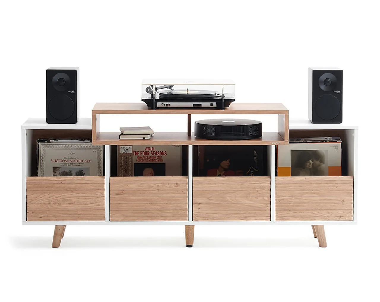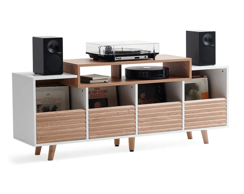 - Velika zgornja površina za gramofon in zvočnike: omarica je zasnovana kot celovit vinilni in Hi-Fi center, saj zgornja plošča sprejme gramofon, na obeh straneh pa je prostor tudi za knjižne zvočnike.