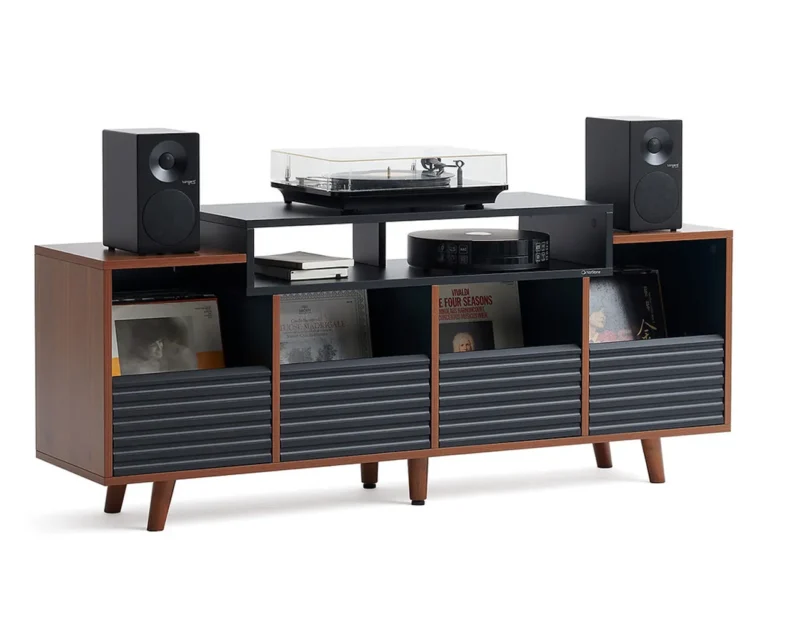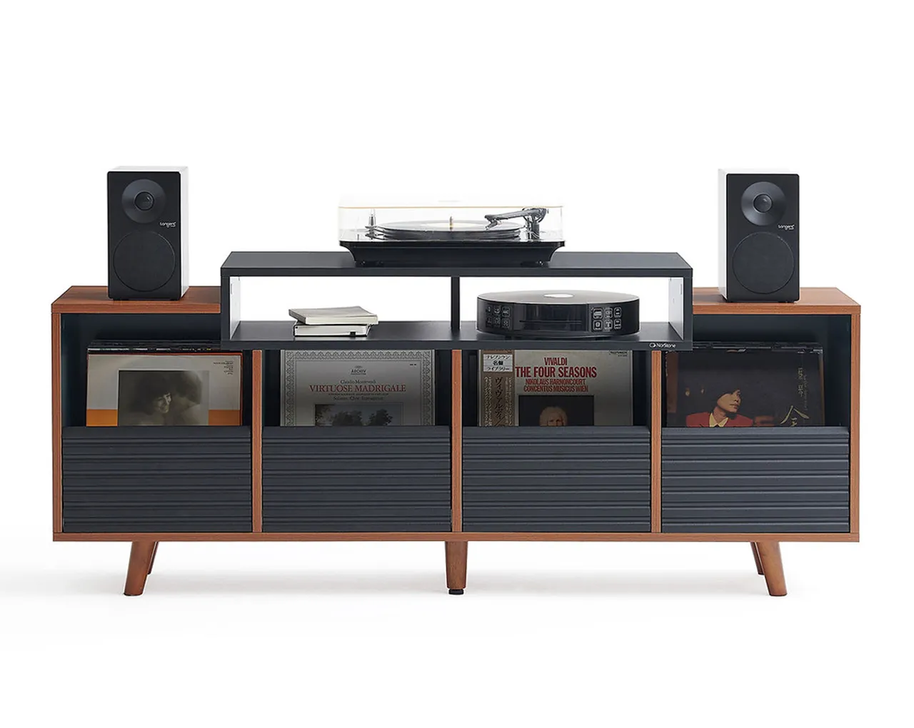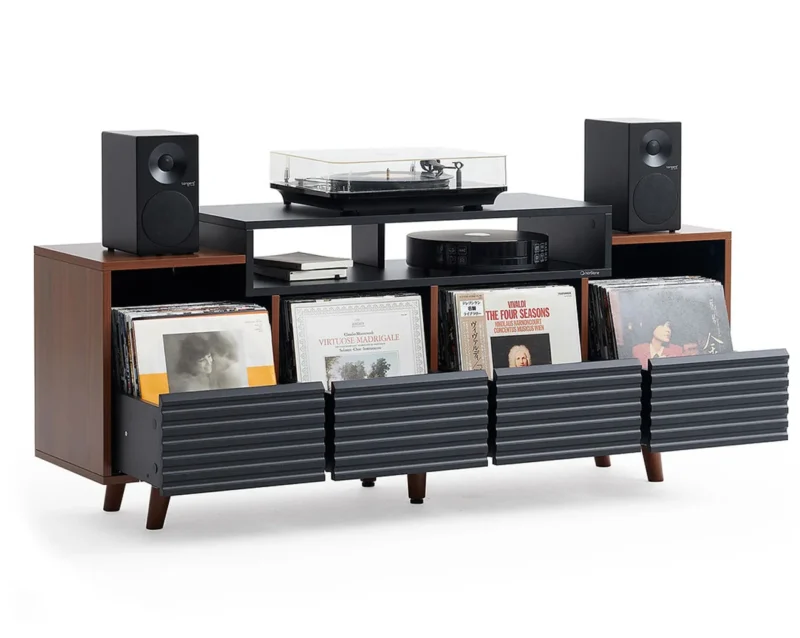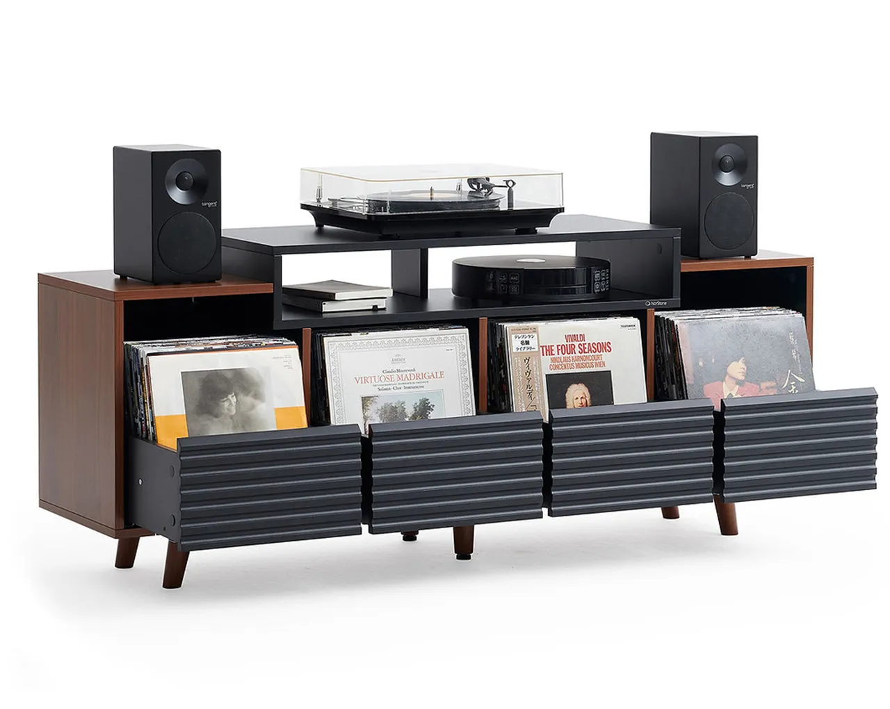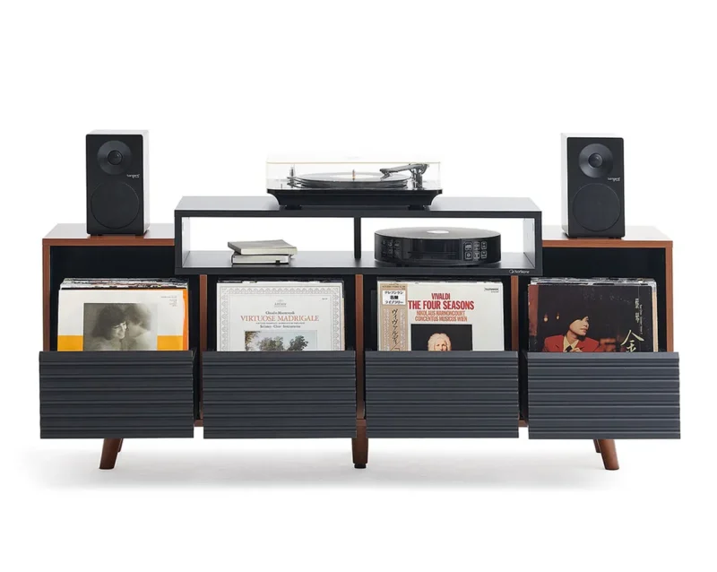 - Prostor za do 320 vinilnih plošč: štirje prostorni predali omogočajo varno in pregledno shranjevanje velike zbirke LP plošč.
