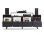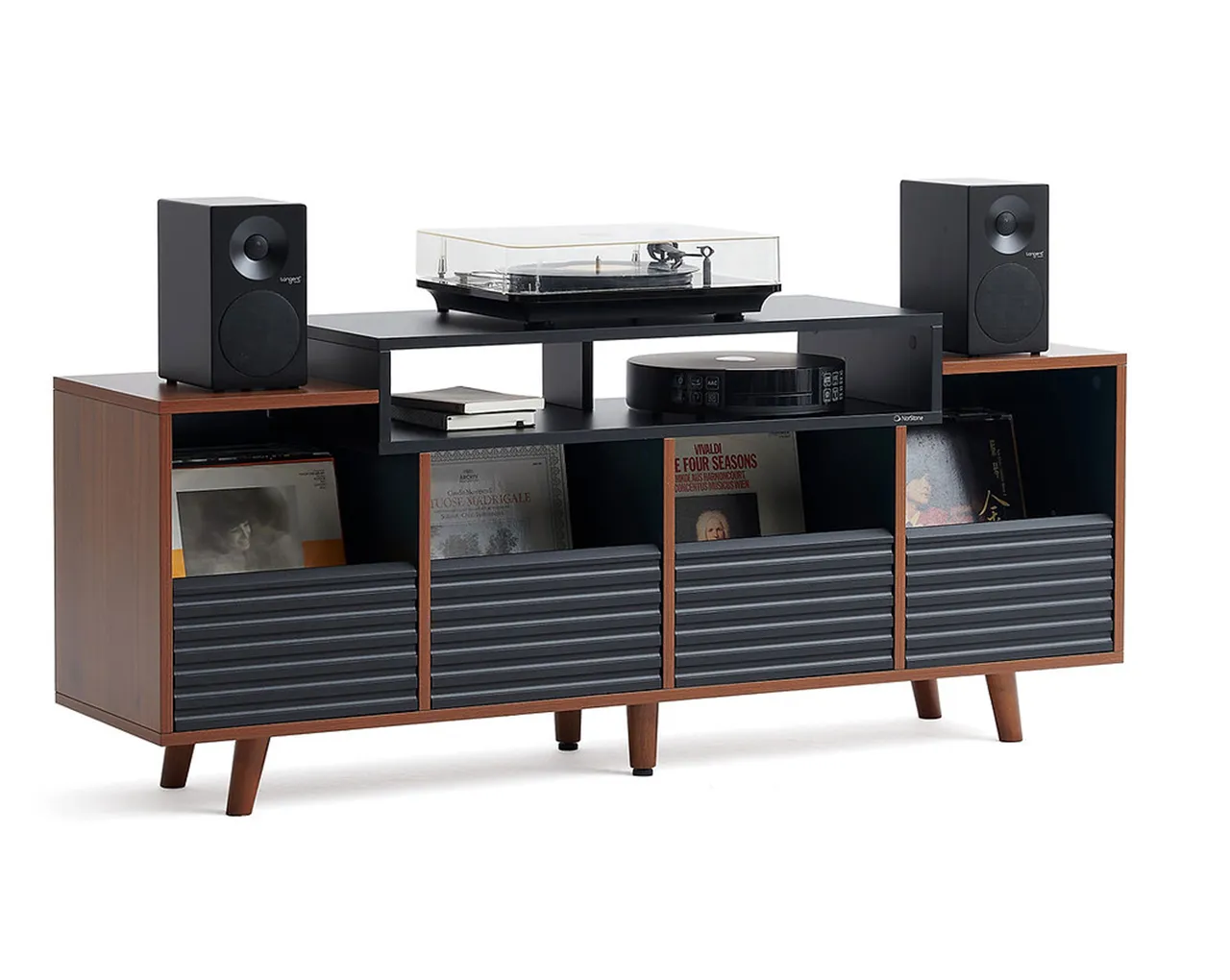 - Velika zgornja površina za gramofon in zvočnike: omarica je zasnovana kot celovit vinilni in Hi-Fi center, saj zgornja plošča sprejme gramofon, na obeh straneh pa je prostor tudi za knjižne zvočnike.