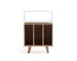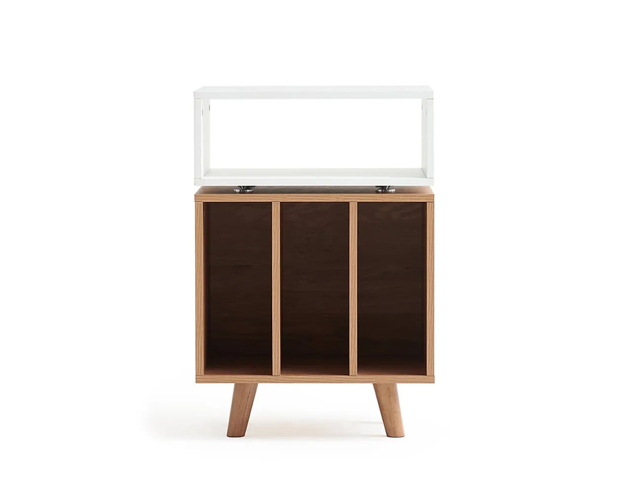 Spodnji del omarice je razdeljen v tri navpične predelke, ki omogočajo pregledno razvrščanje vinilnih plošč po izvajalcih, zvrsteh ali obdobjih. Kapaciteta do 80 LP plošč je odlična za uporabnike, ki želijo imeti najljubšo zbirko vedno pri roki, hkrati pa ohraniti red in zaščito ovitkov.