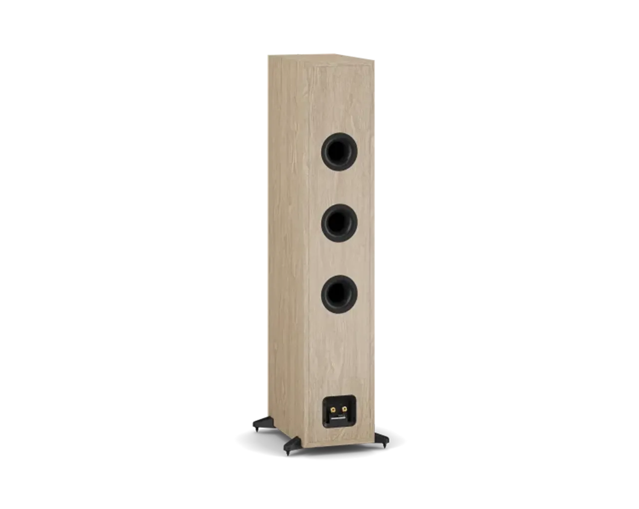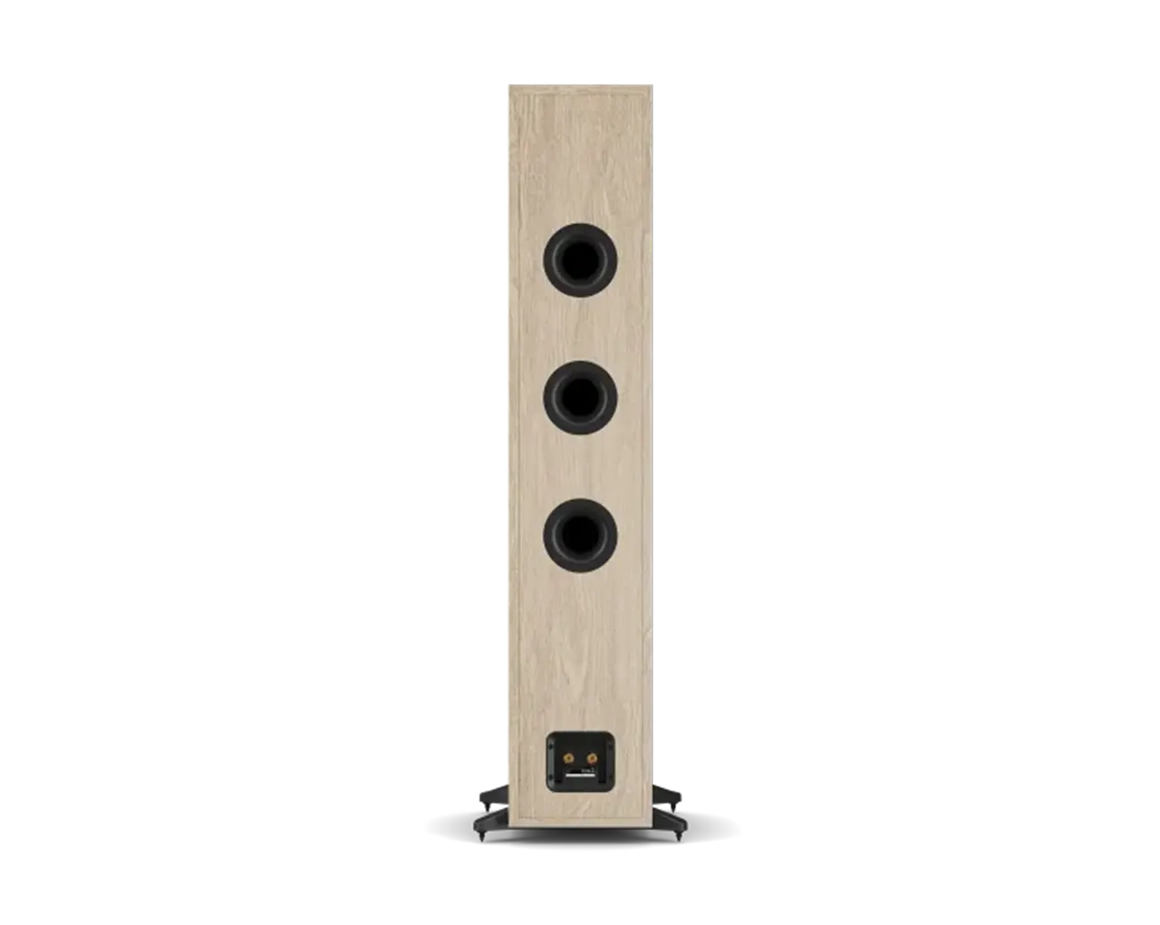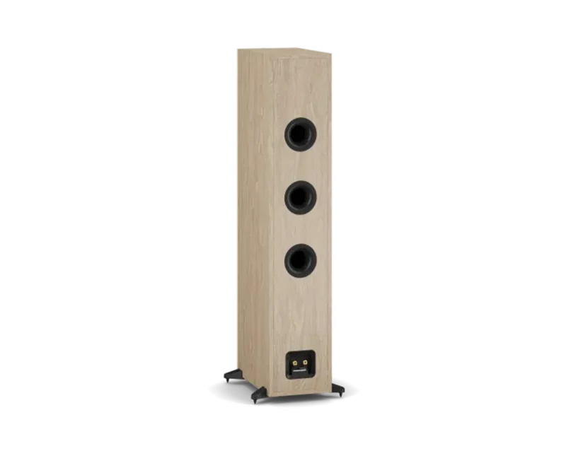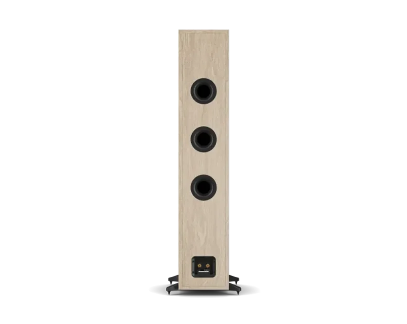 Trije veliki nizkotonci z lahkimi, togimi membranami iz mešanice papirja in lesnih vlaken zagotavljajo hiter odziv in globok razteg nizkih tonov. Bas ni le močan, temveč izjemno definiran – brez zamika, brez zameglitve in brez umetnega poudarjanja.