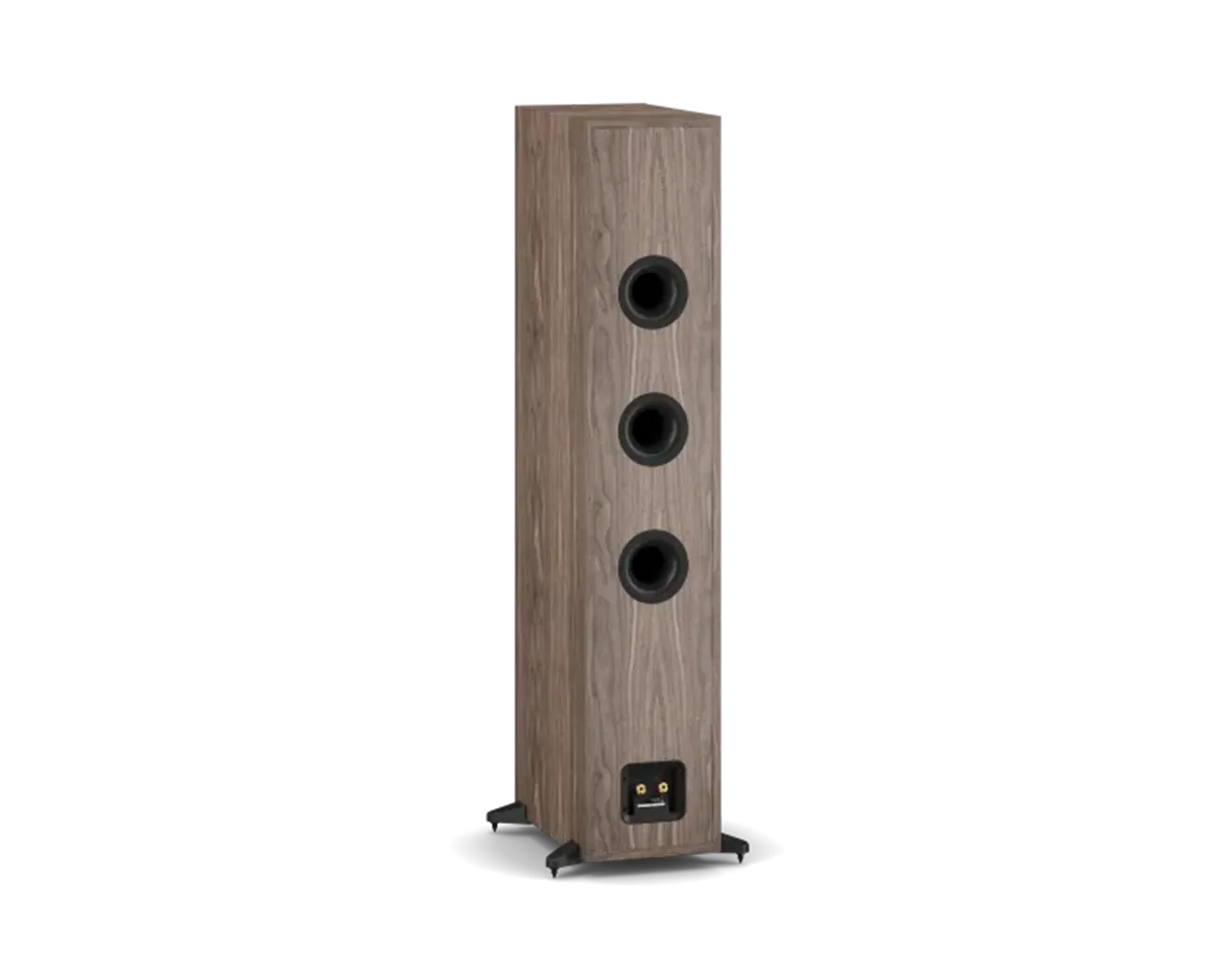 Trije veliki nizkotonci z lahkimi, togimi membranami iz mešanice papirja in lesnih vlaken zagotavljajo hiter odziv in globok razteg nizkih tonov. Bas ni le močan, temveč izjemno definiran – brez zamika, brez zameglitve in brez umetnega poudarjanja.