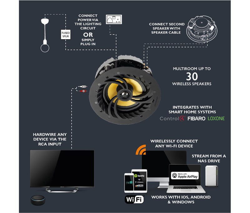 WiFi vgradni zvočnik LitheAudio je večnamenski brezžični stropni sistem z 2.4GHz Wi-Fi ter z večsobno podporo. Združuje ojačevalnik, Wi-Fi sprejemnik, predvajalnik in visokokakovosten HiFi zvočnik. Popoln diskreten sistem vse v enem. So tudi edini stropni zvočniki s certifikatom AirPlay 2, ki so danes na voljo na trgu. Samo vklopite, povežite svojo napravo in začutite zadovoljstvo brezžičnega poslušanja.