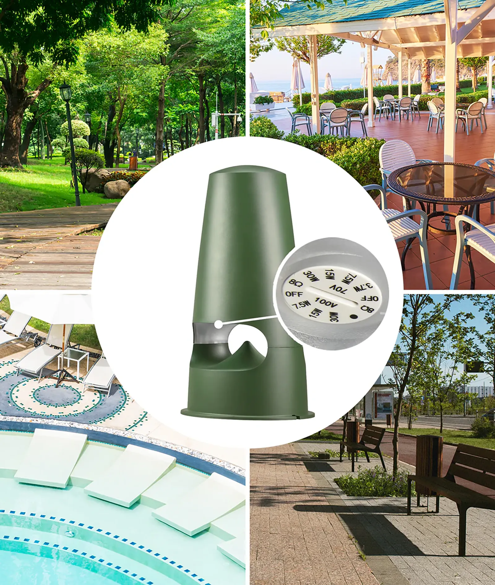 - Priporočena uporaba: Vrtovi, terase, bazeni, bari, hoteli – stalna zunanja montaža