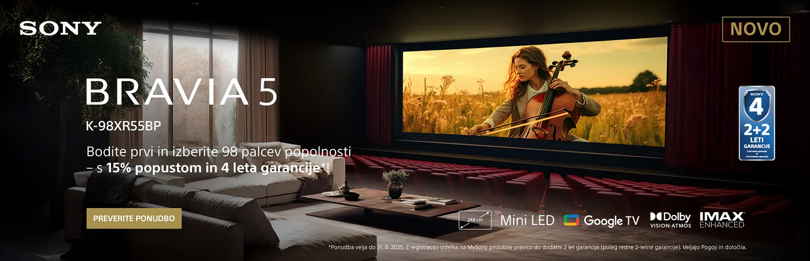 Sony Bravia 5 98″ (K‑98XR5) je televizor, ki ne le prikazuje, ampak oživlja vsebino. S svojo elegantno, skoraj brezrobno obliko, postane osrednji del dnevne sobe – že na pogled navduši. Pritegne s sliko z živimi barvami in globokimi kontrasti, ki so videti kot iz bogatega filmskega sveta.